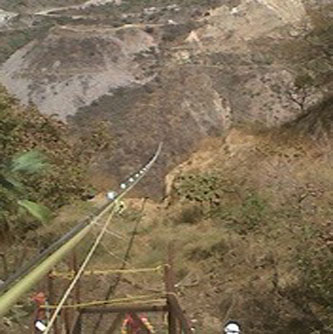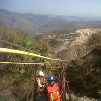 a través de cruce colgante a más de 600 metros de altura en la mina Dos Filos del grupo Gold Corp, en Mezcala, Guerrero, México.